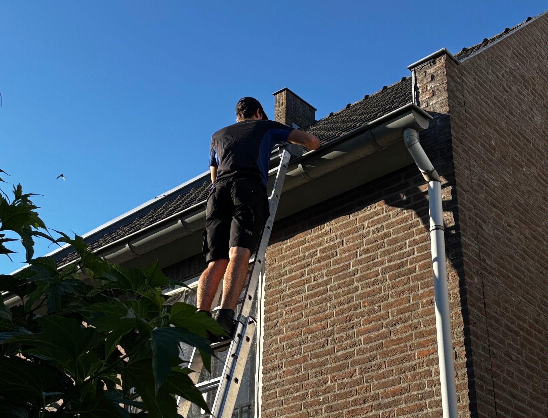 Dakgoten volledig gereinigd en doorgespoeld zodat regenwater weer vrij kan doorstromen.